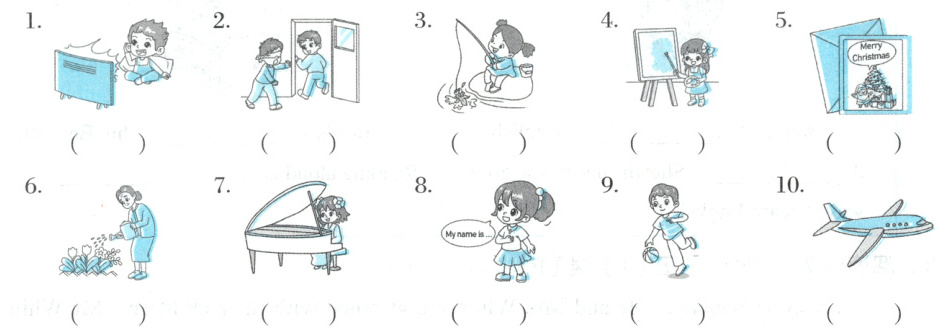 A. watch TV B. go fishing C. play hide-and-seek D. practice my English E. play basketball F. make a model G. play the piano H. draw a picture I. make a card J. water plants