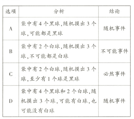 例 3★ 一个不透明的袋中装有 4 个黑球和 2 个白球,这些球除颜色外无其他差别,随机从袋中一次摸出 3 个球,下列事件是不可能事件的是( )