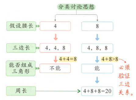 易错提醒:求等腰三角形第三边的长时,在不能确定底边和腰的情况下需进行分类讨论,然后根据三角形的三边关系判断能否组成三角形,把不能组成三角形的情况舍去。