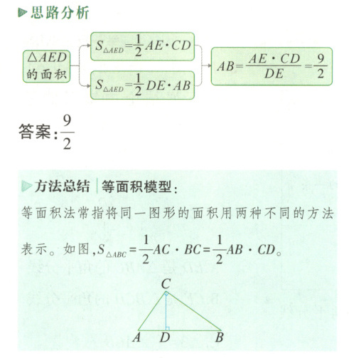 例4 如图,AB⊥BD,垂足为B,AC⊥CD,垂足为C,且AC与BD交于点E。若AE = 5,DE = 2,CD = 5,则AB的长为________。