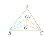 2. ★★立如图,在△ABC中,∠A = 72°,∠ABC,∠ACB的三等分线交于点O₁,O₂。