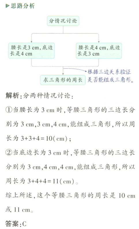 例1 ☆(分类讨论思想)等腰三角形的两条边长分别为3cm和4cm,则这个等腰三角形的周长是( )