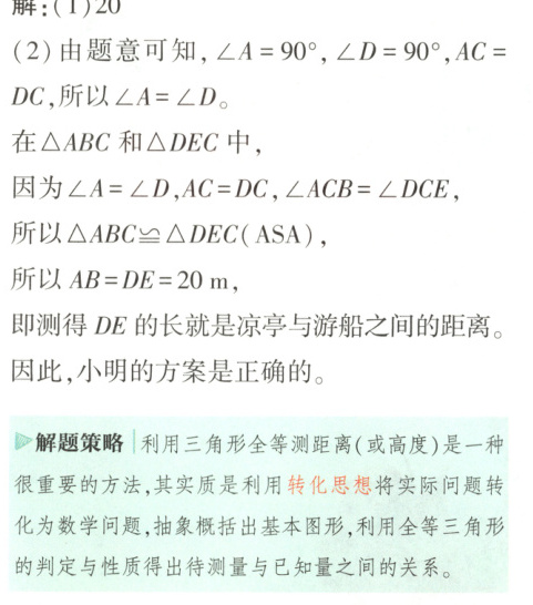 例5:[郑州中原区期末]如图,小明站在堤岸凉亭A点处,正对他的B点(AB与堤岸垂直)停有一艘游船,他想知道凉亭与这艘游船之间的距离,就制定了如下方案。
