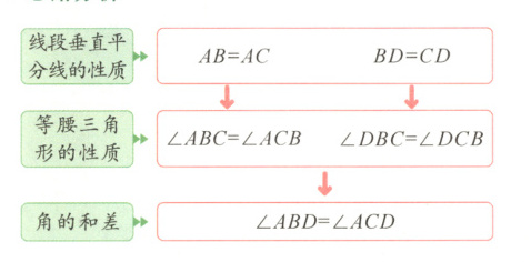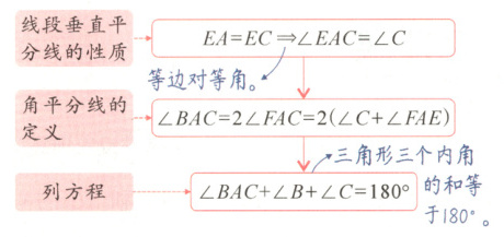 技巧点拨:利用垂直平分线的性质可得到相等的线段,再利用等腰三角形的性质可将线段的等量关系转化为角的等量关系。