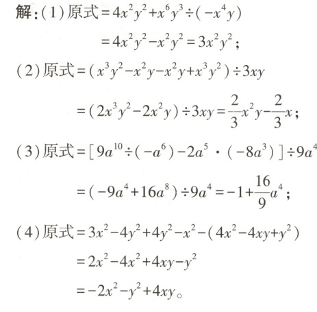 知识点睛:多项式的每一项分别除以单项式时,要逐项计算,不能漏项,且要注意符号的变化。