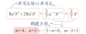 例4 (方程思想)若8a²bᵐ÷28aⁿb² = $\frac{2}{7}$b²,则m = ________,n = ________。