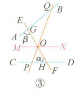 如图③,过点O作MN//CD,则∠EOM = ∠α = 50°,∠MOP + ∠CPO = 180°。