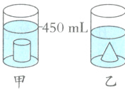 6. 两个大小相同的透明量杯中,都盛有300 mL水,将等底等高的圆柱形零件与圆锥形零件分别放入两个量杯中,此时甲量杯中水面刻度如图所示,则圆柱形零件的体积是( )$cm^3$,圆锥形零件的体积是( )$cm^3$。