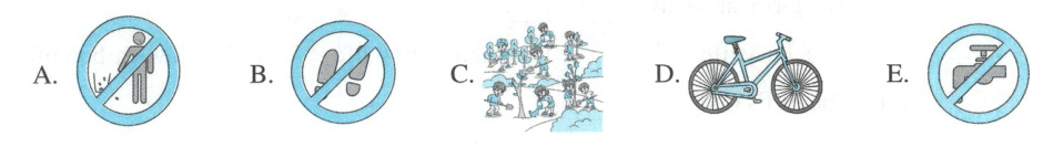 提示短语:save water, plant trees, keep off the grass, go to school by bus, print on both sides of the paper...