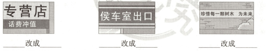 13.新趋势综合实践(东城区·改编)“寻找错别字”。下面是某同学在街头找到的有错别字的三幅图,请你来改正。(写在对应的图片下边)(3分)