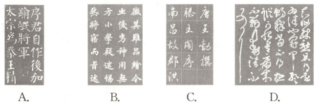 9.小林搜集了和汉字书法有关的许多资料,他发现唐代书法家颜真卿的楷书作品具有恢宏雄壮、大气磅礴的特点。请你和小林一起根据颜真卿楷书的特点,从下列书法作品中选出颜真卿的作品,将序号用“√”标出。(2分)