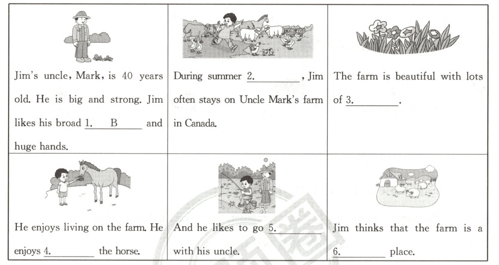 七、(通州区·改编)看图,读故事,选择单词填空,将正确选项的序号填在横线上。(1题的答案已给出)(10分)