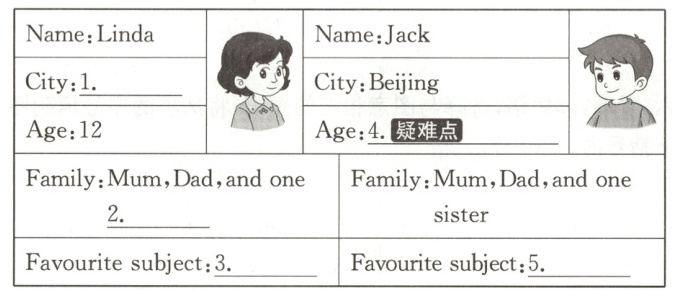4. 10 疑难解析 此题的疑难点为学生对短文的理解及年龄的计算。由“This is my friend Linda. She is twelve years old.”“That is her brother. His name is Jack.”“Jack is two years younger than his sister.”可知“Linda 12 岁,Jack 比 Linda 小 2 岁,即 10 岁”。