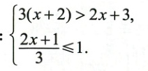 (2)$\begin{cases}3(x + 2)>2x + 3,①\\\frac{2x + 1}{3}\leqslant1,②\end{cases}$
