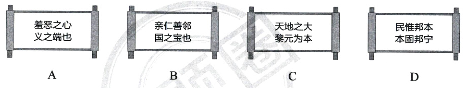 A【解析】本题考查自尊的特点。“羞恶之心,义之端也”意思是羞耻心就是施行义的开始,强调了要有羞耻之心,知道什么是可耻的,从而约束自己的行为,体现了“行己有耻”,A符合题意;“亲仁善邻,国之宝也”表达的是亲近仁义,与邻国友好相处,这是国家的宝贵财富,强调的是国家对外交往的原则,未体现“行己有耻”,B不符合题意;“天地之大,黎元为本”意思是天地虽然广袤无垠,但是黎民百姓才是国家的根本,强调以人民为根本,未涉及“行己有耻”,C不符合题意;“民惟邦本,本固邦宁”意思是人民是国家的根本,根本稳固了国家才会安宁,突出人民的重要性,与“行己有耻”无关,D不符合题意。故选A。