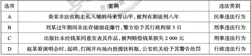 D[解析]本题考查违法行为的分类。警告属于行政责任,适用于行政违法行为。赵某看演唱会时,干扰了公共场所秩序,公安机关给予其警告处罚,其行为属于行政违法行为,D符合题意。有期徒刑属于刑罚,适用于刑事违法行为。从“被判有期徒刑”可知,柴某的行为是刑事违法行为,A错误。行政拘留属于行政责任,适用于行政违法行为。刘某被行政拘留,由此判断其行为属于行政违法行为,B错误。赔偿损失属于民事责任,适用于民事违法行为。出版社被判赔偿钱某损失,说明其行为属于民事违法行为,C错误。故选D。