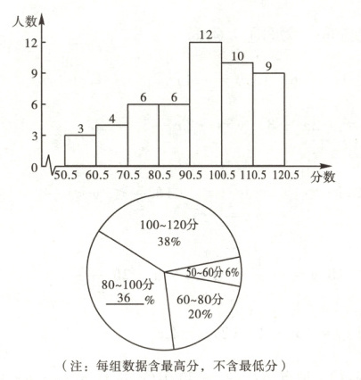 23. (7分)九年级某班两名学生对本班一次数学成绩(得分取整数,满分120分)分别用了两种方法进行了一次初步统计,制成如图所示的两幅尚不完整的统计图,结合图中信息解答下列问题: