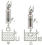 5.如图甲所示,放在水平桌面上的溢水杯盛满水,用弹簧测力计挂一个实心铁块,其示数为F1;如图乙所示,将铁块缓慢浸没水中(未接触溢水杯),溢出的水流入小烧杯,弹簧测力计的示数为F2。下列判断正确的是 ( )