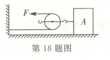 18.如图所示,在3 N的拉力F作用下,重为20N的物体A以0.2hs的速度匀速移动了0.4 m,不计滑轮重及滑轮与绳之间的摩擦,则拉力F所做的功是______J,功率是_____w。