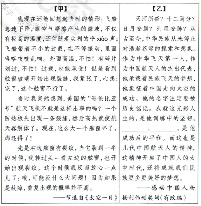 9. 阅读【甲】文,你从中感受到杨利伟的什么精神品质?请根据【甲】文的内容,并联系上下文语境,为【乙】文空缺处补充恰当的语句。(2分)