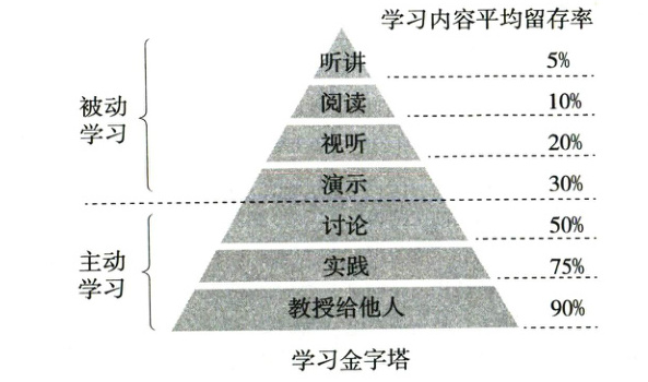 (2)示例:学习内容平均留存率在30%及以下的演示、视听、阅读、听讲的学习方式一般都是被动学习;而学习内容平均留存率在30%以上的讨论、实践、教授给他人的学习方式一般都是主动学习。这启示我们,学习方式不同,学习效果就不一样,我们在学习的过程中要学会主动学习。