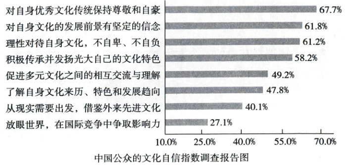 (1)示例:中国公众的文化自信主要体现在中华优秀传统文化方面,最不自信的是在国际竞争中的影响力。中国公众对自身的文化发展信念坚定,表现出比较积极的文化自信和热情。