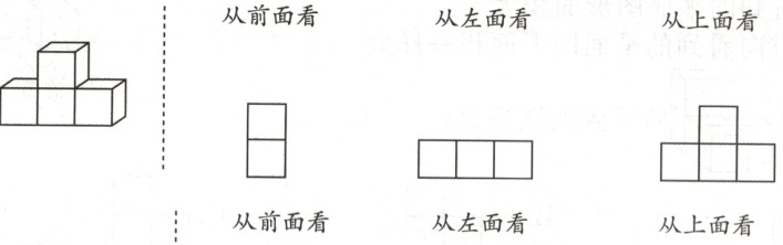 5. 用5个大小相等的小立方体搭成下面三个立体图形,从前面、左面、上面看到的平面图形如下表。请选择填空。