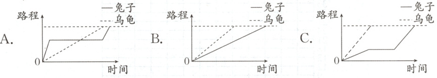 2. “龟兔赛跑”:领先的兔子看看慢慢爬行的乌龟,骄傲起来,睡了一觉。当它醒来时发现乌龟快到终点了,于是急忙追赶,但为时已晚,乌龟还是先到达了终点。在下面三幅图所示的时间与路程关系中,最符合龟兔赛跑这则故事的是( )。