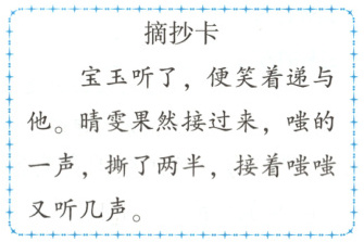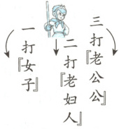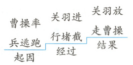 [点拨]本题考查辨析能力。由图一可知,画面上是一个人怀抱柳树,把柳树从土中拔出,可以判断这是鲁智深倒拔垂杨柳的故事。图二由“宝玉”“晴雯”可以判断这是《红楼梦》中的故事,由“嗤的一声,撕了两半”可知,这是撕扇子作千金一笑的故事。图三,由事情的起因、经过和结果可以判断,这是关羽华容道义释曹操的故事。图四的主人公是孙悟空,由“一打女子,二打老妇人,三打老公公”的内容,可以判断这是孙悟空三打白骨精的故事。