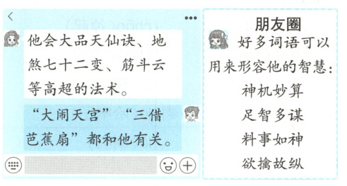 [点拨]本题考查阅读积累。第一张图,根据“七十二变”“筋斗云”“大闹天宫”“三借芭蕉扇”等可知是孙悟空。第二张图中的词语都可以用来形容诸葛亮。