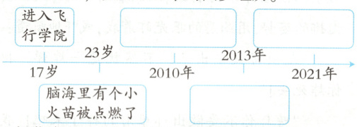 2010年:成为我国首批女航天员中的一员2013年:入选神舟十号航天员2021年:乘坐神舟十三号载人飞船再度问鼎苍穹[点拨]本题考查整体感知的能力。短文第①段写王亚平17岁进入飞行学院;第②段写王亚平23岁时,神舟五号升空,杨利伟实现飞天梦点燃了她脑海中的小火苗;第③④段写2010年,王亚平成为我国首批女航天员中的一员,以及艰苦的训练;第⑤段写2013年,王亚平成功入选神舟十号航天员;第⑥段写2021年,王亚平乘坐神舟十三号载人飞船再度问鼎苍穹。据此提炼关键语句填写。