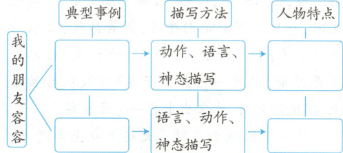 【点拨】本题考查整体感知的能力。例文通过写容容的两个典型事例表现了容容的特点。第一件事,容容每天帮“我”取报纸,有一天“我”忘了尊重容容的“权利”,自己去取了报纸,容容委屈地跟奶奶哭闹,“我”赶紧把报纸放回去,她这才高兴起来,从中可以看出容容天真可爱、忠于职守的特点;第二件事,容容对信产生了兴趣,把“我”的信封拿去,装了片树叶塞进邮筒,并忍不住告诉“我”她给“我”寄信的事,从中可以看出容容天真可爱、好奇心强的特点。据此选择恰当的内容补全思维导图即可。