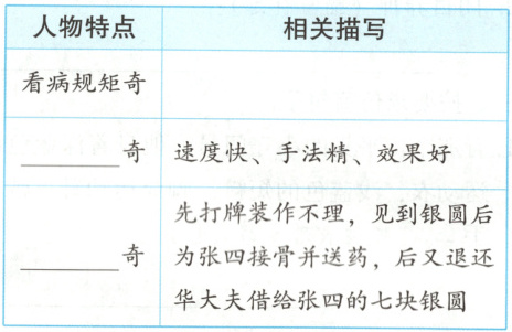 [点拨]本题考查整体感知的能力。文章第2~4自然段用具体事例表现了苏大夫的特点。第2自然段主要写三轮车夫张四求医,苏七块打牌不理;第3自然段主要写牙医华大夫借钱给张四,苏七块为张四接骨并赠药;第4自然段主要写苏七块把七块银圆还给华大夫。
