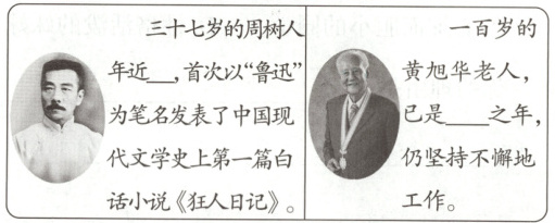 D[点拨]根据人物名片可知,鲁迅发表《狂人日记》时是三十七岁,年近四十。 “不惑”指人四十岁,因此第一个横线处应填“不惑”。黄旭华老人已一百岁。 “期颐”指人一百岁,因此第二个横线处填“期颐”。答案选D。