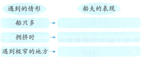 【点拨】本题考查获取信息的能力。由选段内容可知,本段采用总分结构,分别写了船多时,船夫操纵自如,毫不手忙脚乱;拥挤时,船夫总能左拐右拐地挤过去;遇到极窄的地方,船夫总能平稳地穿过,而且速度非常快,还能急转弯这三方面内容,根据内容寻找关键信息,填空即可。