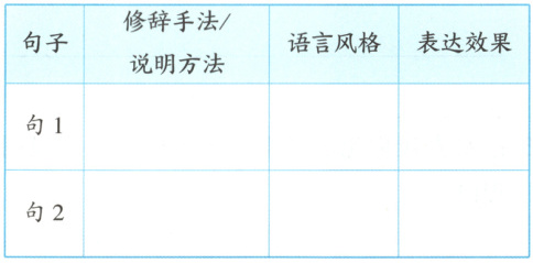 [点拨]本题考查理解句子。作答时,仔细阅读句子,辨析两个句子之间的不同,然后补全表格。句1中的“它像漂浮在沙海中的三座金山”运用了比喻的修辞手法,语言活泼,生动形象地表现了金字塔的壮观;句2中的“50层楼高”“相当于126个篮球场那么大”运用列数字和作比较的说明方法,语言平实,数据科学准确,突出了金字塔的高大宏伟。