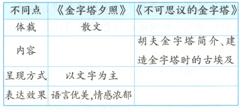 [点拨]本题考查对比阅读的能力。《金字塔夕照》是一篇抒情散文,描写了夕阳下金字塔的雄浑之美及作者观赏时的万千思绪,文章情感浓郁,融情于景,字里行间充满对金字塔的赞美。《不可思议的金字塔》是一篇非连续性文本,采用图文结合的表达方式,提供了丰富的有关金字塔的信息,能够帮助读者高效、全面地了解金字塔的概貌。