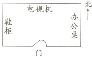 芳芳家客厅的南面是门。电视机在客厅的( )面,办公桌在客厅的( )面,鞋柜在客厅的( )面。
