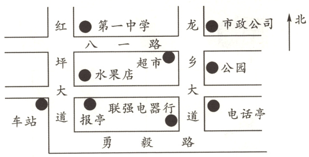 (2)第一中学在红坪大道的哪面? 在八一路的哪面? 在龙乡大道的哪面?