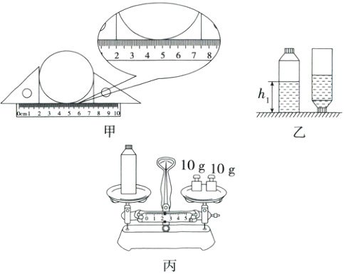 (1)用刻度尺测容积。①小明用两个三角板、一把直尺测量瓶子的直径,如图甲所示,则直径D = ____cm;②将瓶子装适量水正放在水平桌面上,用刻度尺测量水面高度h1,再将瓶子倒放如图乙所示,测出____的距离h2,算出瓶子容积。小华认为这样测量的结果不准确,原因是____。