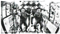 23.[2024安徽]2024年4月25日20时59分,搭载神舟十八号载人飞船的长征二号F遥十八运载火箭在酒泉卫星发射中心成功发射。26日5时04分,在轨执行任务的神舟十七号航天员乘组顺利打开“家门”,欢迎神舟十八号航天员乘组入驻“天宫”空间站。随后,两个航天员乘组面向镜头向牵挂他们的全国人民报平安(如图所示)。下列说法正确的是 ( )
