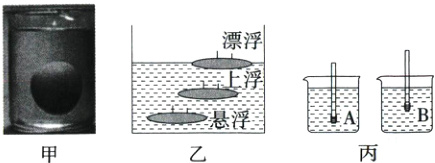 C.将一木棒下端缠一些铜丝制成简易密度计,分别放入A、B两液体中,静止时如丙图所示,简易密度计在A液体中排开液体的质量等于在B液体中排开液体的质量