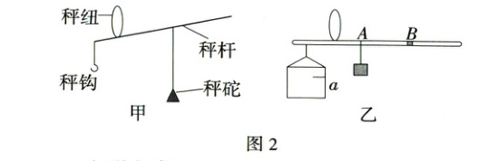 ②杯中不加液体,提起秤纽,移动秤砣,当秤杆在水平位置平衡时(如图2乙所示),将此时秤砣的悬挂点A标记为“0”刻度;