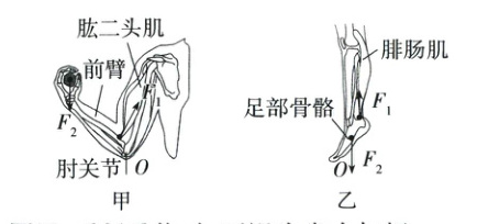 D 解析:如图甲,手托重物时,肘关节处视为支点,肱二头肌对前臂的牵引力是动力,动力臂小于阻力臂,所以可视为费力杠杆,A、B错误;如图乙,踮脚时,动力臂变短,但是动力臂仍然大于阻力臂,可视为省力杠杆,C错误;根据杠杆五要素可知,向上踮脚的过程中,腓肠肌对足部骨骼的牵引力是动力,D 正确。