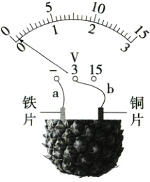 12.[2024湖北武汉一模]把铜片、铁片插入菠萝中,制成一个水果电池,用电压表测量它的电压,如图所示。下列说法正确的是 ( )