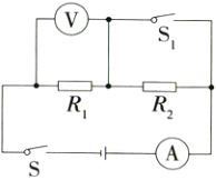 8.[2024天津二模]如图所示,电源电压恒定,已知R1 = 10 Ω,当S闭合时,电流表示数为0.8 A,电压表示数为U1。当S、S1都闭合时,电流表示数增加了0.4 A,电压表示数为U2,则电阻之比R1∶R2 = ______ ,电压表示数之比U1∶U2 = ______ 。