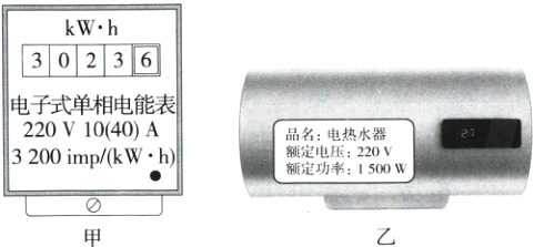 解析:电热水器是利用电流的热效应工作的;图甲中电能表的示数为3023.6kW·h;电能表指示灯1min内闪烁80次,消耗电能$W=\frac{n}{n_{0}}×3.6×10^{6}J=\frac{80}{3200}×3.6×10^{6}J = 9.0×10^{4}J$;电热水器的实际功率$P=\frac{W}{t}=\frac{9.0×10^{4}J}{60s}=1500W$,等于其额定功率,则其两端电压等于其额定电压220V。