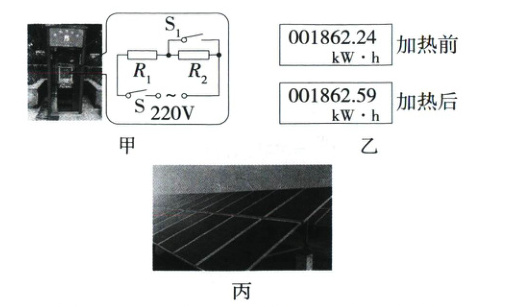 (3)为节能减排,相关部门计划在该公园安装如图丙所示的太阳能电池为饮水机供电。已知晴天1m²太阳能电池一天能发电0.4kW·h,要求所有太阳能电池晴天一天的发电量能供饮水机使用3天。饮水机每天正常工作加热时间计为3h,保温时间计为8h,求至少要安装多大面积的太阳能电池。