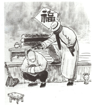 【点拨】本题考查名著情节。结合图片可知,蹲在地上的人是祥子,拿着枪站着的人是孙侦探。此图涉及的情节是祥子辛辛苦苦积攒的买车钱被孙侦探敲诈走了。