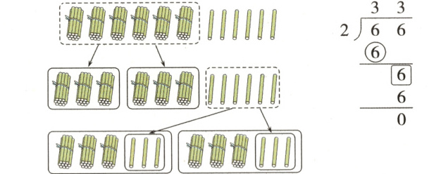 (1)下面是66÷2的计算过程,竖式中“〇”圈起的“6”表示( ),“□”圈起的“6”表示( )。